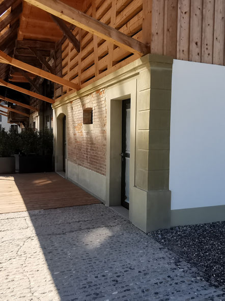 Der Brüggstock wurde zunächst vom Baumeister neu betoniert und anschließend von uns mit den alten Steinen verkleidet, um den historischen Charakter des Gebäudes zu erhalten. Im Innenbereich haben wir die Wände neu gekröndelt und bewusst sichtbar belassen, um die natürliche Schönheit des Steins hervorzuheben und dem Raum eine authentische, rustikale Atmosphäre zu verleihen.